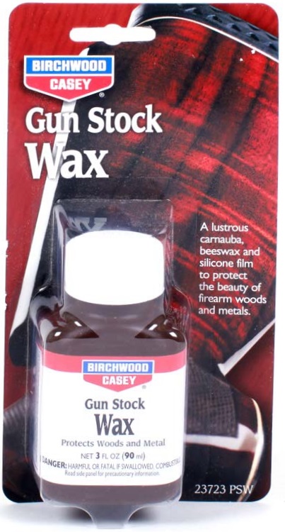 The Birchwood Casey® Gun Stock Wax is a high-quality formula combining protective and beautifying qualities of the finest carnauba, beeswax and silicone. Produces a lustrous water repellent film that will not rub off like oils. Offers maximum protection against finish cracking from weather and handling. Enhances and protects the beauty of woods (such as firearm stocks), metals and leather (such as slings). Great conditioner for all stocks. Adds a lustrous water repellent sheen to your stock.