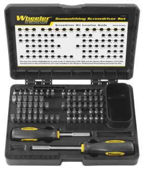 Wheeler's Deluxe Gunsmithing Screwdriver Set is the kit that belongs on every gunsmithing bench - the well thought-out bit selection will put an end to burred, buggered, busted up screw slots on any gun that comes your way. The bits make up the heart of any screwdriver set, and Wheeler's are the finest available. They're made from S2 tool steel and hardened to 56-58 Rockwell "C." Unlike other screwdriver suppliers,Wheeler's engineers measured the screws on over one hundred modern and antique firearms to make sure that we offered bits for every situation.