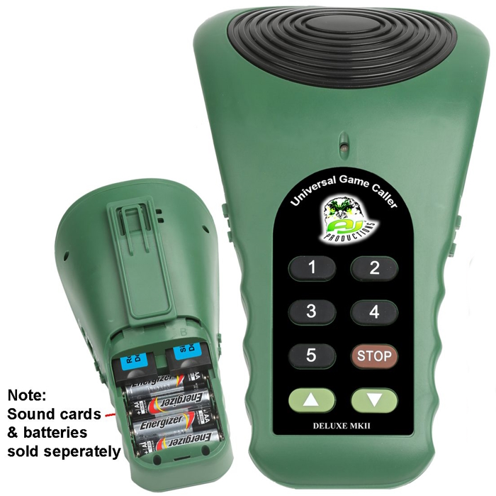 The A J Productions Deluxe Electronic Universal Game Caller features an interchangeable sound card system and can be remotely operated from up to 100 metres away via the Wireless Controller.