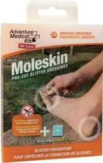 Adventure Medical Kits' new super soft, super adhesive moleskin is also user-friendly with its pre-cut shapes and sizes for quick and easy application. The larger oval shape pieces include pre-cut inner holes for creating a 'donut' for the blister to fit in.