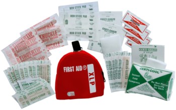 Features: Featherweight ripstop nylon bag, Easy Care, Wound care supplies, Trauma pads and gloves, Medications for inflammation, pain, allergic reactions, bites and stings, and heart attack symptoms, Reflective trim makes it easier to find kit in low-light conditions
