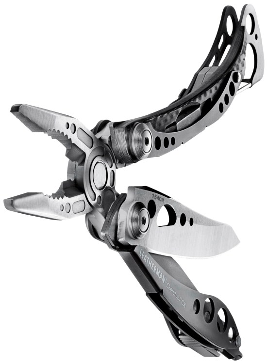 The sleek new Leatherman Skeletool CX gets you back to basics... very cool basics. The Skeletool CX has only the most necessary of multi-tool features, because sometimes that's all you need. With a 154CM stainless steel blade, pliers, bit driver, pocket clip and carabiner/bottle opener, you're set. Lightweight, low volume, perfect size. The Skeletool CX: Who says more is better?